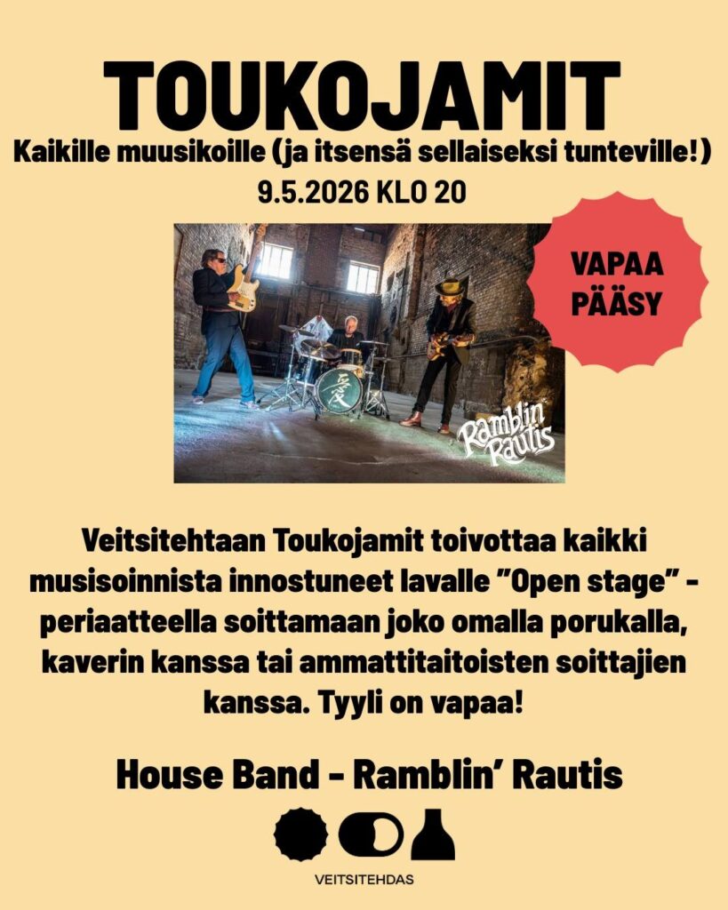 Veitsitehtaan Toukojamit toivottaa kaikki musisoinnista innostuneet lavalle ”Open stage” -periaatteella soittamaan joko omalla porukalla, kaverin kanssa tai ammattitaitoisten soittajien kanssa. Tyyli on vapaa!